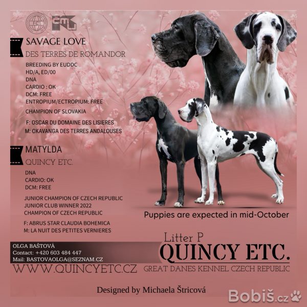 Chovatelská stanice německých dog Quincy etc. nabízí černé fenky po rodičích Garvasio Quincy etc. & Liberté Quincy etc. Oba rodiče mají zdravotní vyšetření a Eu.DDC chovnost. Odběr štěňat možný po 21.5.2024. Štěňata budou očkována, s čipem a mezinárodním PET pasem. Chovatelský servis samozřejmostí.Fenky jsou perspektivní pro výstavy, chov i jako rodinný parťák.